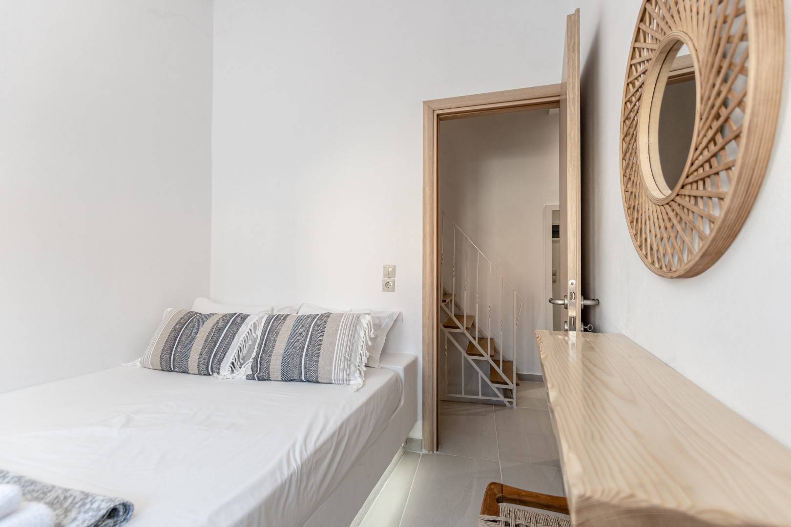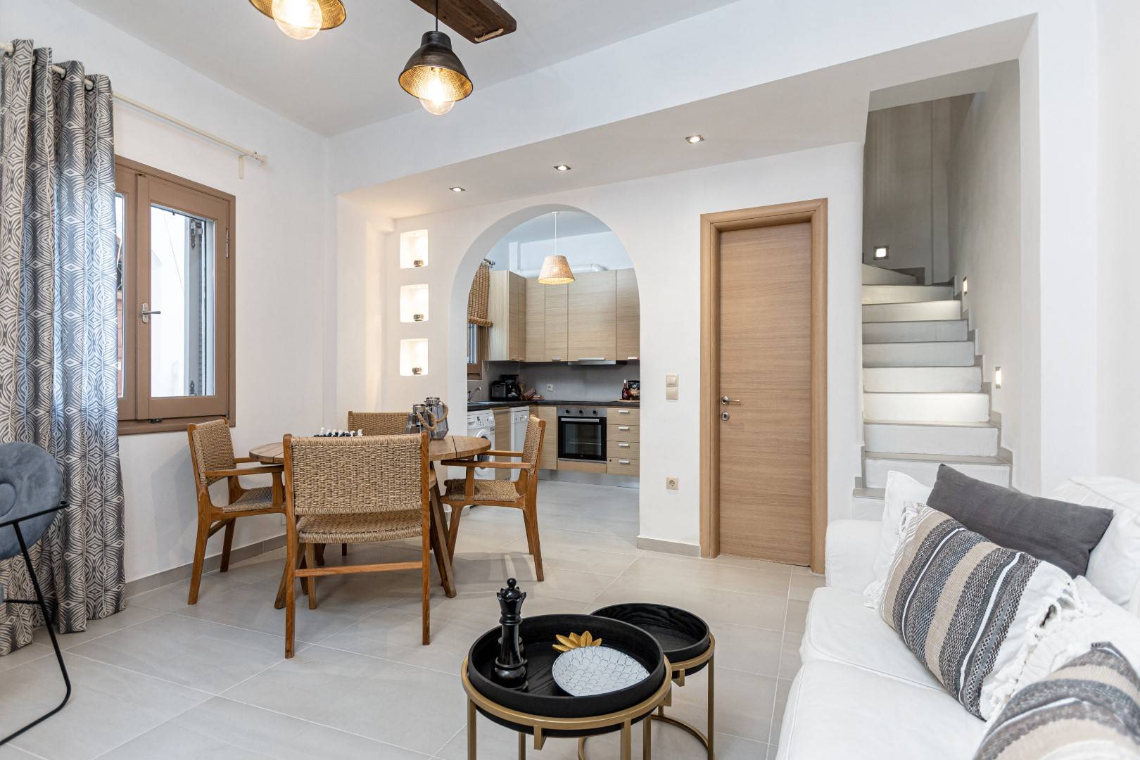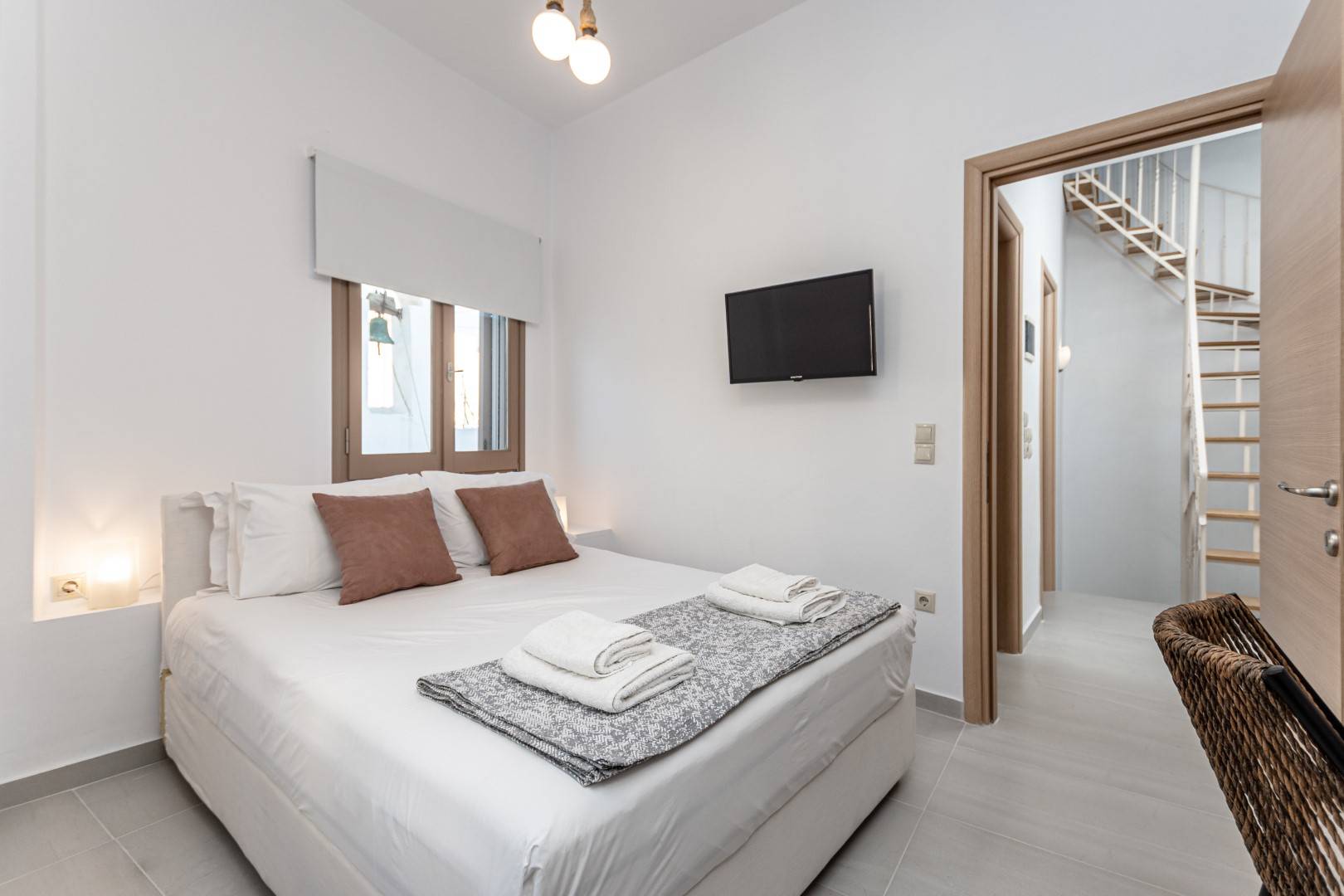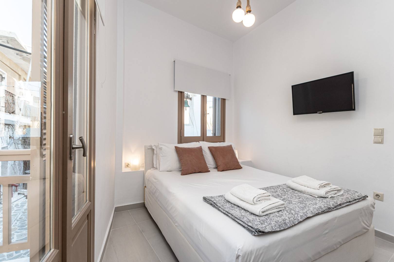 The lovely, fully furnished, contemporary 80m2 house is situated in the heart of the main town of Naxos. There is a dining area and a kitchen complete with a dishwasher and an oven. A flat-screen TV is available. This exceptional home away from home comprises 2 double bedrooms with hallway bathroom and a WC on the lower level. The house has a small but conveniently styled living area and a fully equipped kitchen with all its amenities and comforts. The view of the Naxos town and the Castle can be seen from the private roof terrace. This fully equipped mesmerizing lounge area has a romantic ambiance and holds a beautiful setting for our guests to relax and unwind.