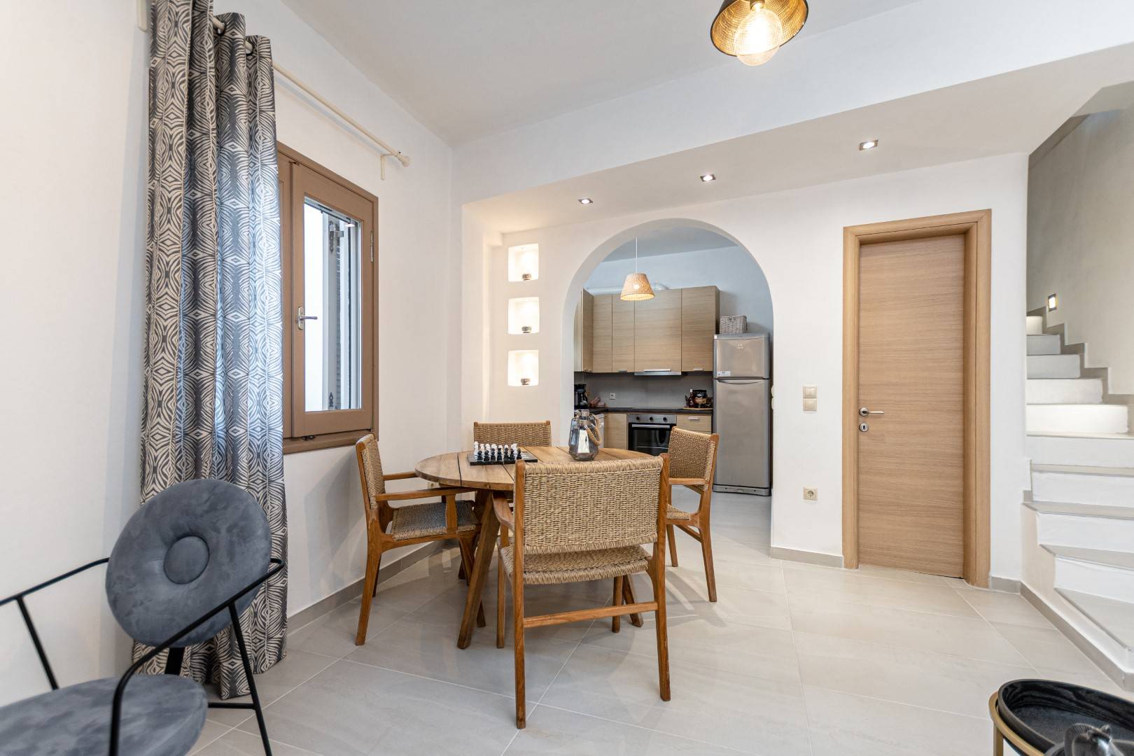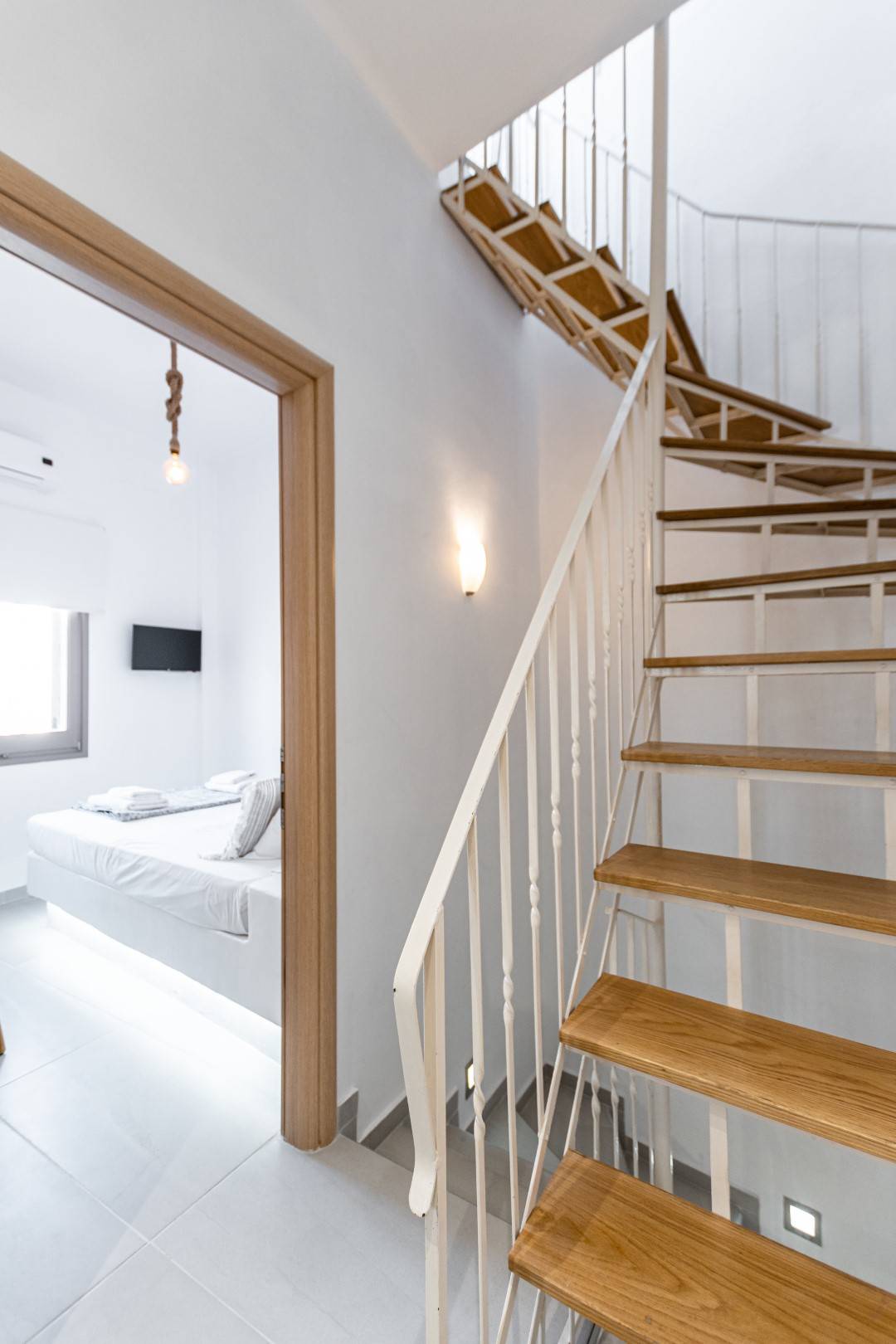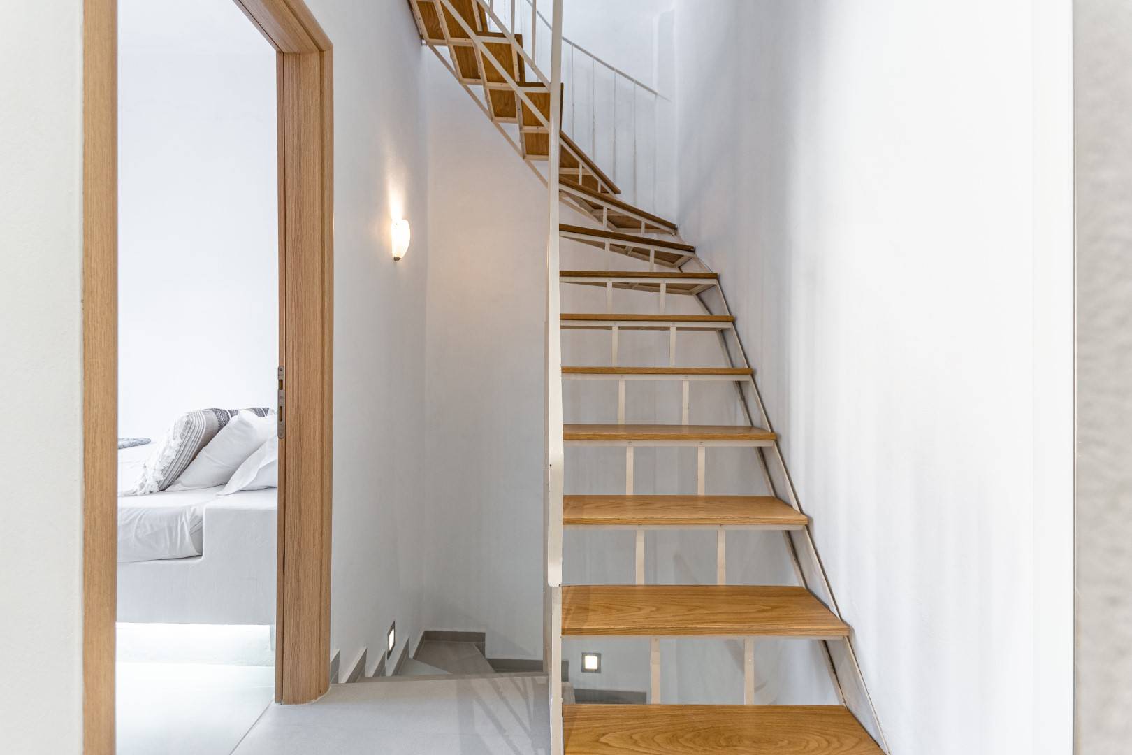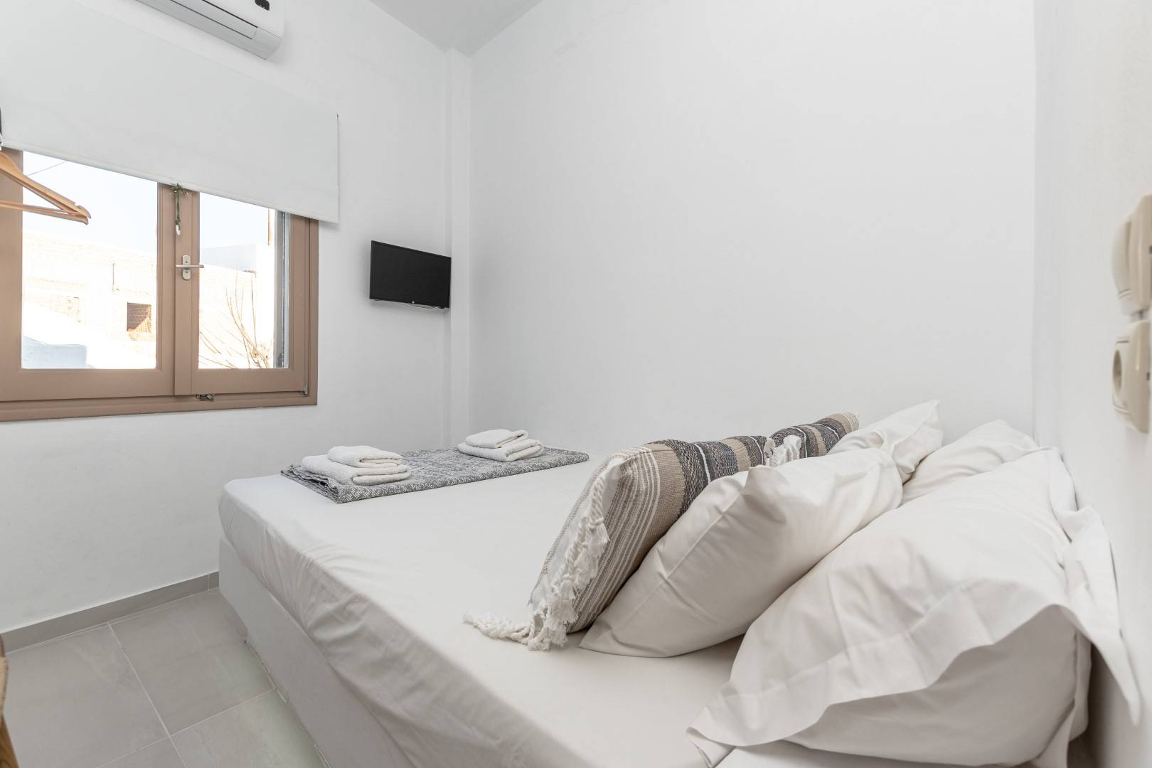 The lovely, fully furnished, contemporary 80m2 house is situated in the heart of the main town of Naxos. There is a dining area and a kitchen complete with a dishwasher and an oven. A flat-screen TV is available. This exceptional home away from home comprises 2 double bedrooms with hallway bathroom and a WC on the lower level. The house has a small but conveniently styled living area and a fully equipped kitchen with all its amenities and comforts. The view of the Naxos town and the Castle can be seen from the private roof terrace. This fully equipped mesmerizing lounge area has a romantic ambiance and holds a beautiful setting for our guests to relax and unwind.