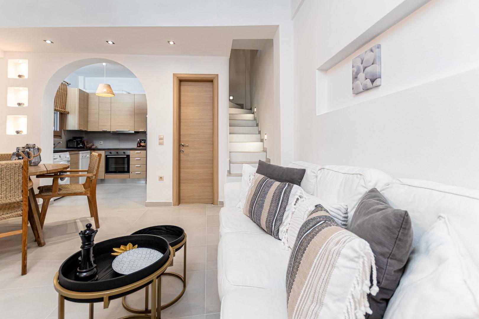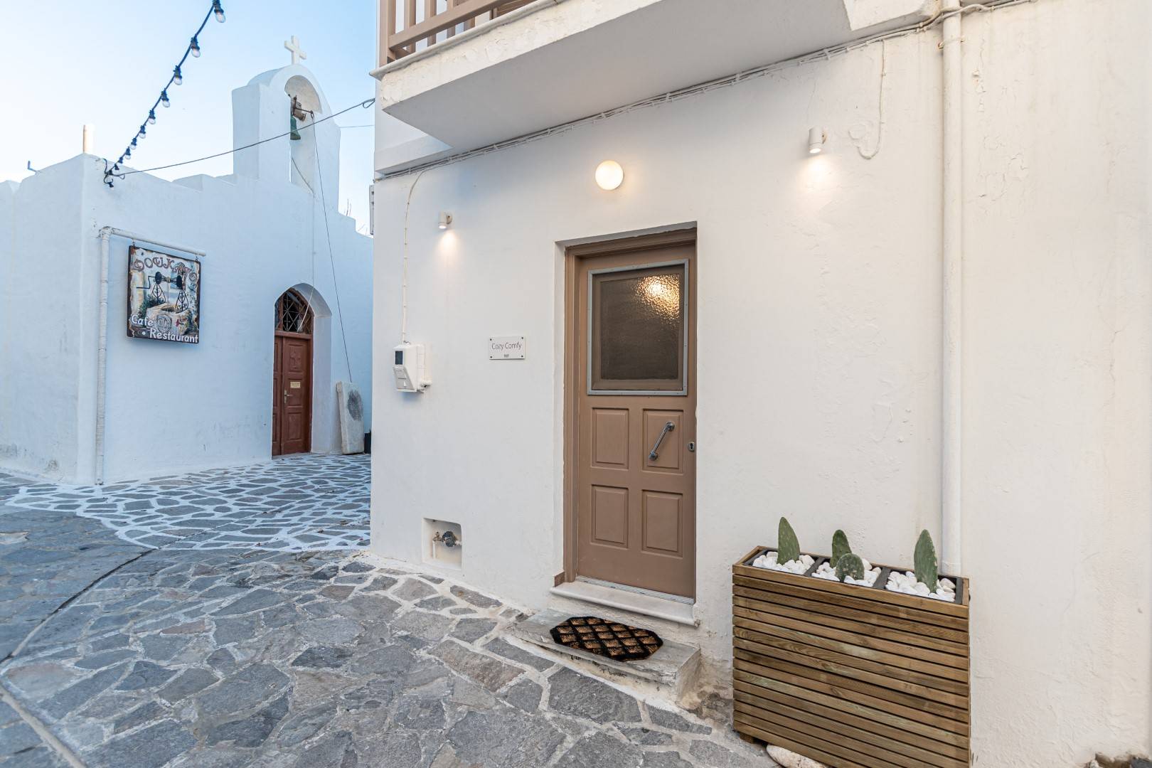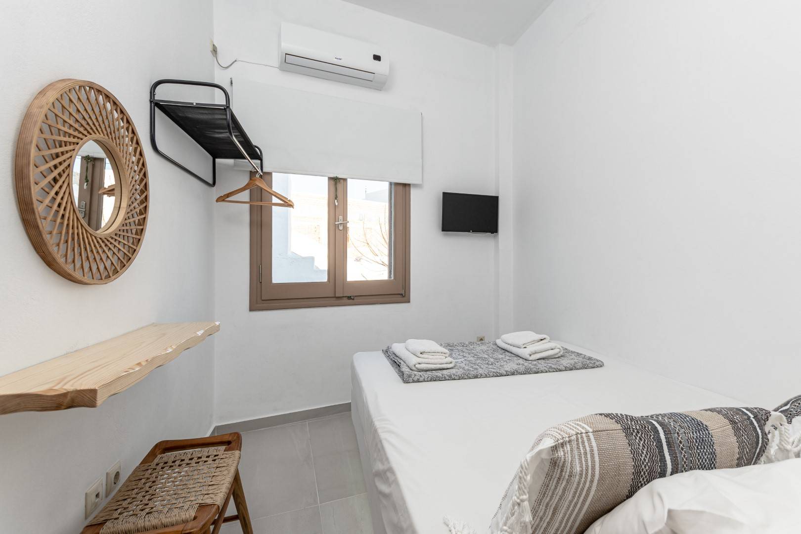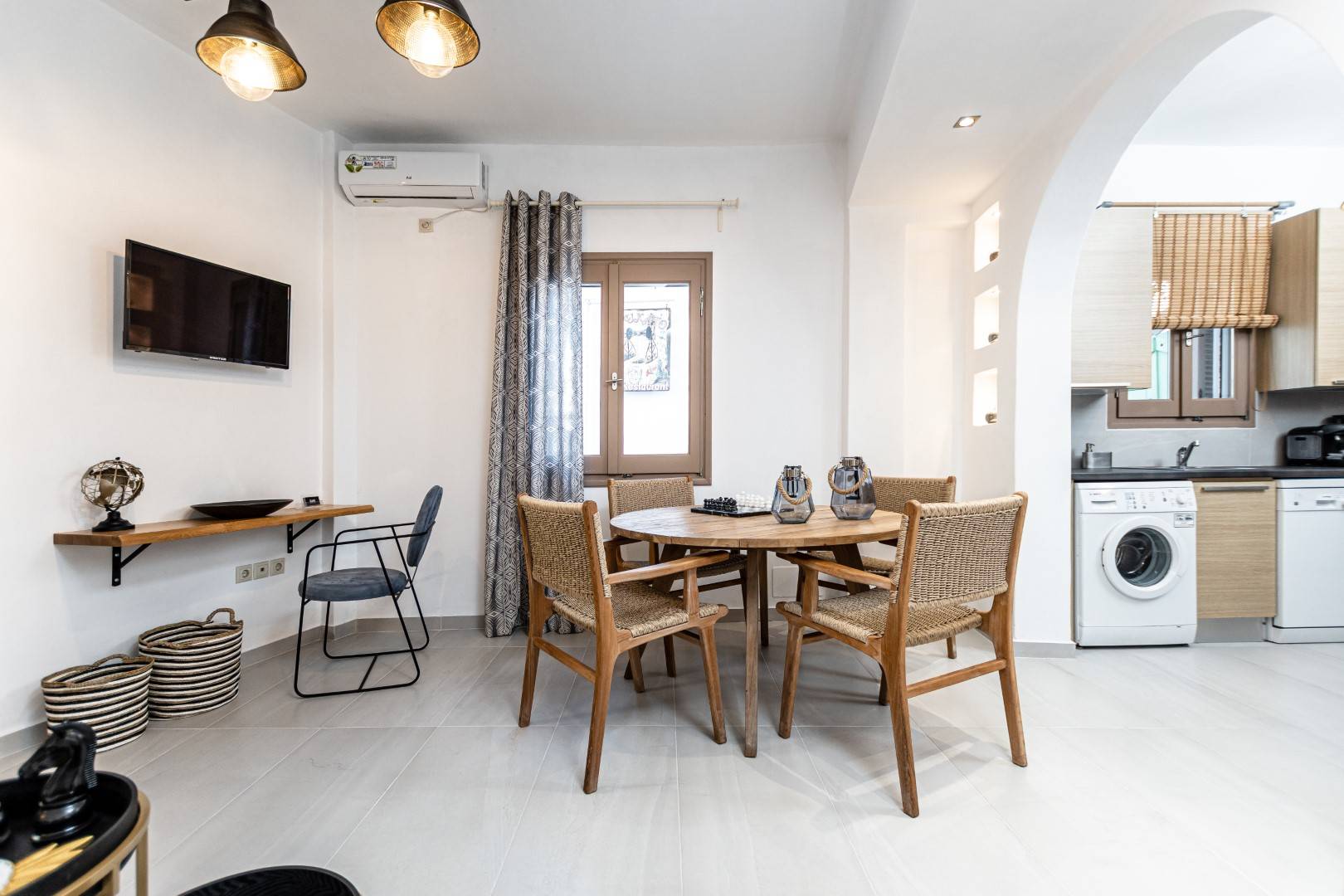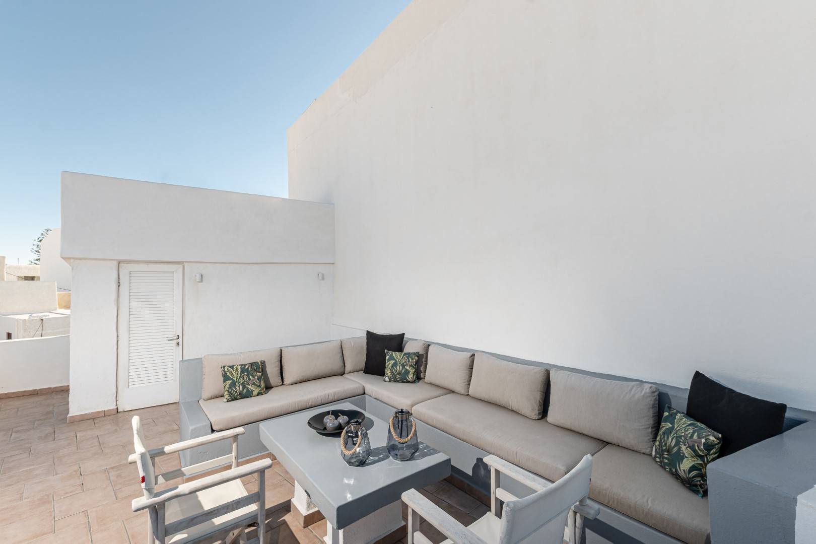 The lovely, fully furnished, contemporary 80m2 house is situated in the heart of the main town of Naxos. There is a dining area and a kitchen complete with a dishwasher and an oven. A flat-screen TV is available. This exceptional home away from home comprises 2 double bedrooms with hallway bathroom and a WC on the lower level. The house has a small but conveniently styled living area and a fully equipped kitchen with all its amenities and comforts. The view of the Naxos town and the Castle can be seen from the private roof terrace. This fully equipped mesmerizing lounge area has a romantic ambiance and holds a beautiful setting for our guests to relax and unwind.